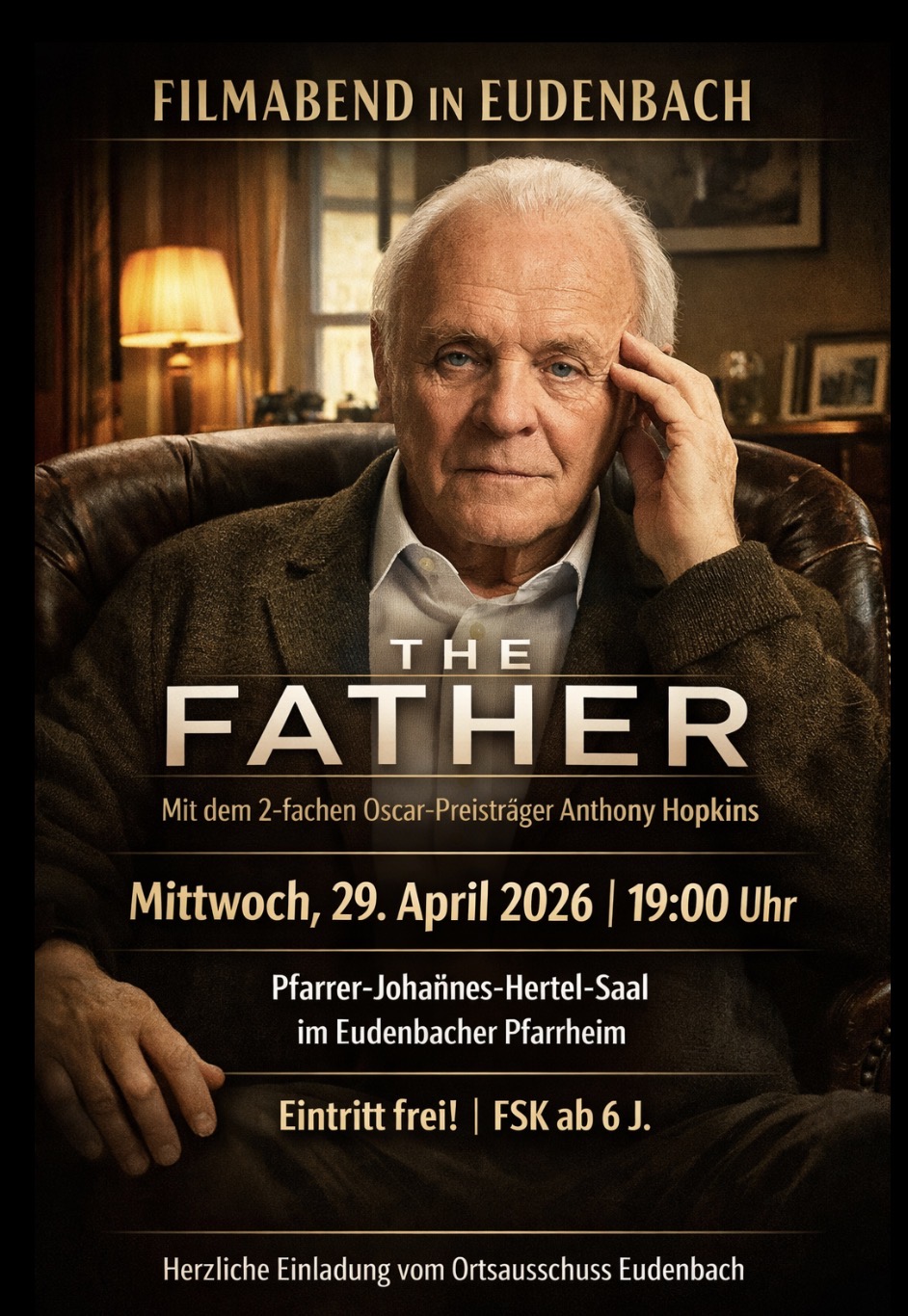 der Ortsausschuss Eudenbach lädt herzlich ein zu einem Filmabend am Mittwoch, 29.April 2026 19:00 Uhr im Pfarrer-Johannes-Hertel-Saal im Eudenbacher Pfarrheim. Gezeigt wird wir der zweifach oskarprämierte Film „The Father“ mit Antony Hopkins in der Hauptrolle.Ein 80-jähriger Mann weigert sich trotz seines hohen Alters, seine komfortable Wohnung in London zu verlassen oder eine Pflegekraft zu engagieren. Doch er leidet an Demenz und ist zunehmend verwirrt. Bis sich herausstellt, dass er bereits bei seiner Tochter und ihrem Ehemann wohnt und dringend auf die Hilfe einer Krankenschwester angewiesen ist. Packendes Drama um Demenz und Identitätsverlust, das konsequent aus Sicht der Titelfigur erzählt ist. Die Verwirrung des Protagonisten überträgt sich somit unmittelbar auf die Zuschauenden. In der Hauptrolle vielschichtig und bravourös gespielt, überzeugt vor allem der Schnitt, der trotz aller Täuschungen und Widersprüche nie die Übersicht verliert. (nach Filmdienst) FSK ab 6 J., Eintritt frei!